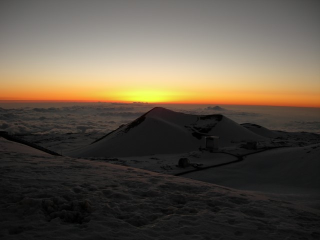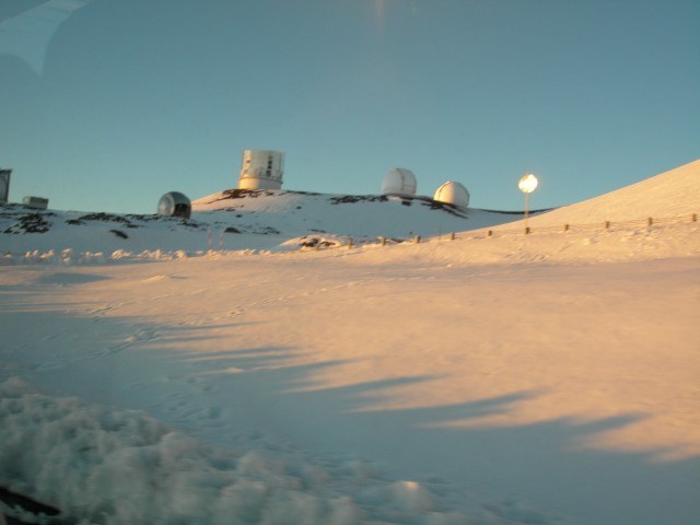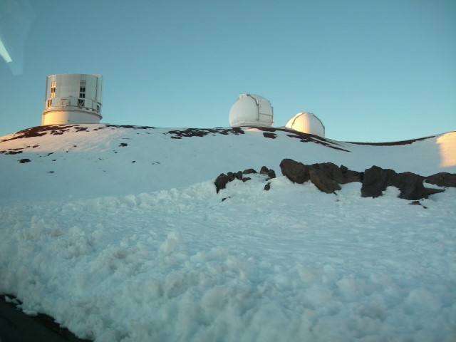 In February 2008 we were in Hawaii on the Big Island and took the opportunity to visit the Mauna Kea summit and the telescopes there. The altitude is 13,800 feet and the climate is about as different from sea level Hawaii as you can imagine. The air is rather thin, there's no jungle vegetation and the overall landscape is more desert than jungle. There's snow on the top and Mauna Kea has the unique distinction of having the only snow plow in Hawaii. In recent years the peak has been home to some of the world's largest telescopes and besides the telescopes it is a special place to visit. It's revered as the place of origin of the Hawaiian people and it is also a dry and high location ideal for optical astronomy. The presence of telescopes in this sacred area has caused some conflict over the years and at the moment there is something of a detente between the astronomers and the native Hawaiians. The summit consists of several different telescopes operated by several different organizations. The entire area is administered by the University of Hawaii. For more details see the links at the end of this page. Because of the altitude and access restrictions we opted for a guided tour. Even if we could have driven up by ourselves we wouldn't have done it. By the time we got the top we were suffering from hypoxia and it was hard to do anything much more than put one foot in front of the other. Our tour began in the morning and included lunch, a visit to the summit, seeing the sunset, and finally returning to the visitor center which is at about 9,000 feet. There we had a chance to do some observing with portable telescopes that our guide brought along. The seeing in this area is just spectacular, even at the lower altitudes and with smaller telescopes. It's easy to see why this is a productive spot for astronomy.