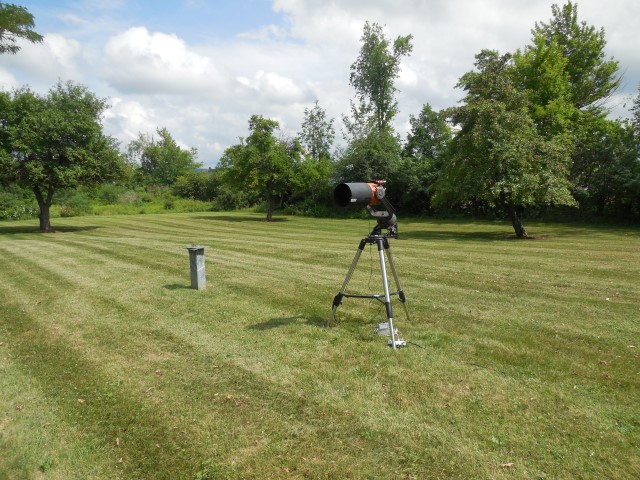 I some observing this way but decided there was a better mounting. After some research I purchased a very sturdy Celestron tripod and the setup doesn't take long. I had thought about a permanent structure like that little dome at Yerkes or the roll off roof at Lowell but eventually decided to keep things portable. One night I did a basic alignment on Polaris and marked the location of the tripod legs. The next day I positioned 3 floor tiles at the locations of the tripod legs. Now I can put the tripod on the tiles and know that the alignment should be pretty good for at least casual viewing.