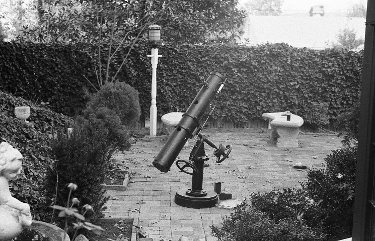 Probably I was in high school when I got my first look through a telescope. A friend had a 4 1/4" Edmund Scientific Newtonian and I think that we got a pretty good look at Saturn. Even though it was in the city the seeing was pretty good that night. I remember thinking that this was SO much better than looking at pictures in a book. Add to that the idea that the light I was seeing came from the Sun, bounced off Saturn and then came right into my eye. That idea of photons traveling that far still gives me shivers. Hopkins gave me a chance to play with a real telescope. Although I didn't take any courses in astronomy I learned a lot from my friends Clay Johnson and John Locke. I am indebted to them to this day for reinforcing my interest in astronomy and helping me to acquire new knowledge and skills outside of the formal undergraduate curriculum that was our normal daily work. Around this time I conceived the idea of having my own telescope and purchased several books on "how to build a telescope". Since this was to be a low budget project (as most of my projects were in those days) I decided to grind my own mirror. Eventually I settled on the traditional Newtonian 6" f/8 design and purchased a mirror grinding kit from Edmund Scientific. It had the mirror, the grinding tool and all the abrasives. Today you can buy a finished mirror but dedicated amateurs will still grind their own. Here are instructions on mirror grinding and they pretty much describe what I did when I made mine. You can still buy the kits. Grinding started around the time I graduated and the mirror was done a year later. Parts from a used mount and tube appeared during graduate school and eventually I was able to cobble together a very sturdy mounting. It must have weighed upwards of 150 lbs and was far from portable but it didn't wobble. There was no clock drive so guiding by hand was the order of the day. The only pictures I ever took with it were short exposures of the Moon. No stars, planets, or deep sky objects. Here are two views of the scope: